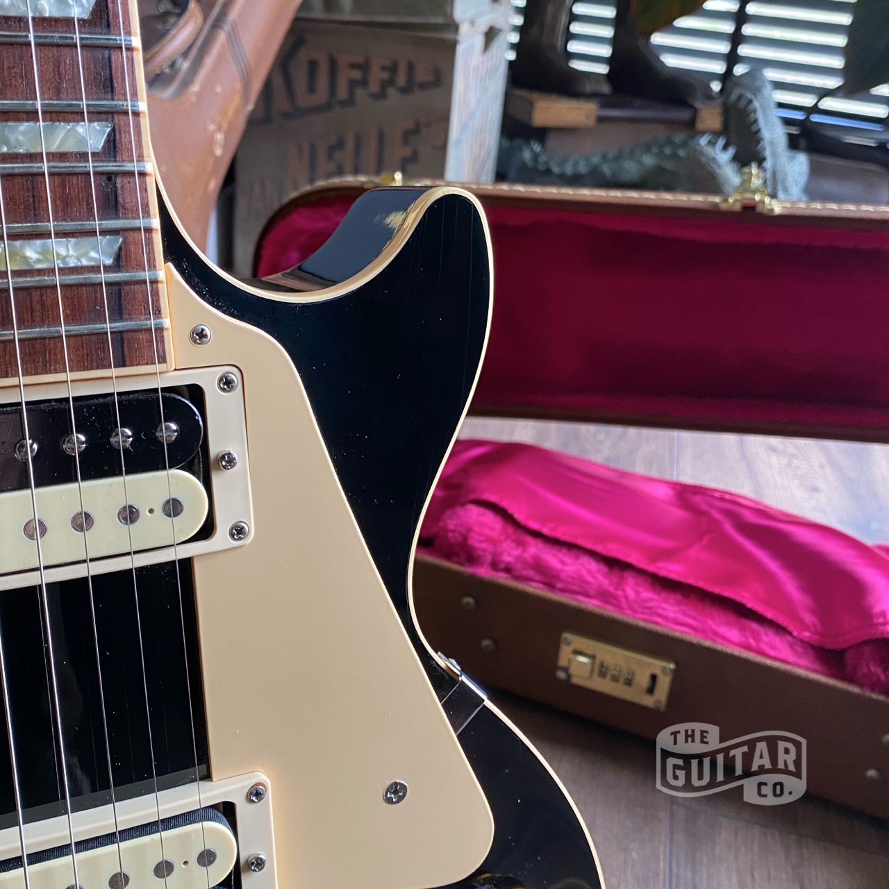 Deze Standard heeft een Mahogany body met een Maple top, uitgevoerd in een zwarte finish met crème binding. De Mahogany hals heeft een comfortabel profiel en is voorzien van een Rosewood toets met trapezoid inlays. De frets zijn in goede staat.